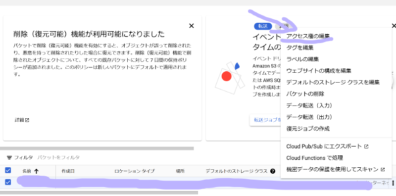 - 选择创建完成的储存桶,点击图中所示选项(修改储存分区权限)。