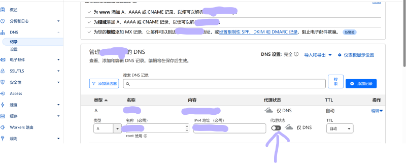 打开Cloudflare控制台,配置DNS记录。添加A或AAAA记录指向负载均衡器分配的IP。并且,关闭代理,使其代理状态为仅DNS解析。若打开代理,则打开了Cloudflare的免费CDN,在前期调试时建议关闭,或者打开Cloudflare的开发模式以跳过缓存,后期可根据需要开启。