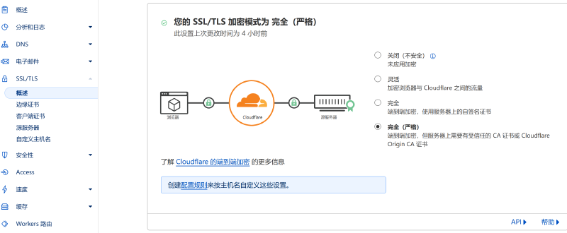 SSL/TLS页面,选择加密模式为完全(严格)。注 如果您在创建均衡器时没有选择HTTPS,那么这里需要关闭加密或改为灵活模式。